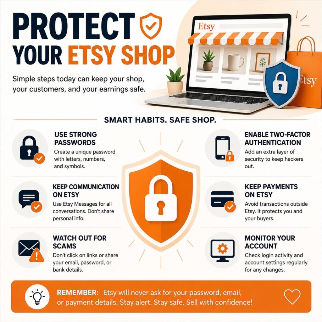 Protect your Etsy shop by using strong passwords and enabling two-factor authentication. Keep all communication and payments within Etsy.